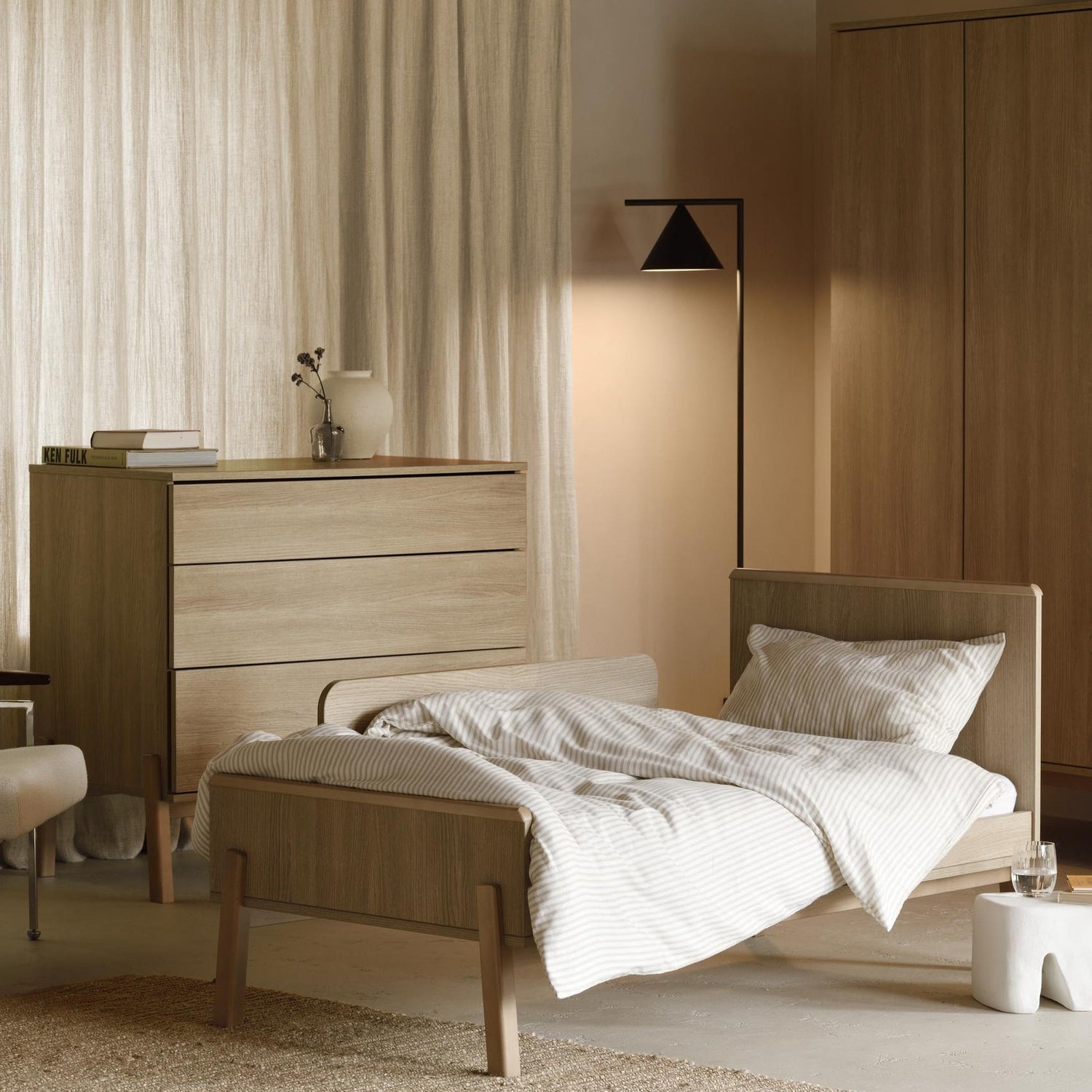 Die Wickelkommode vereint modernes Design mit einem sanft integrierten Push-System und großzügigem Stauraum. Die abnehmbare Wickelplatte sorgt für maximale Flexibilität und macht die Kommode zu einem langlebigen, nachhaltigen Begleiter weit über die Wickelzeit hinaus. Das Babybett wächst zum Juniorbett mit, sodass es nachhaltig und langjährig genutzt werden kann.